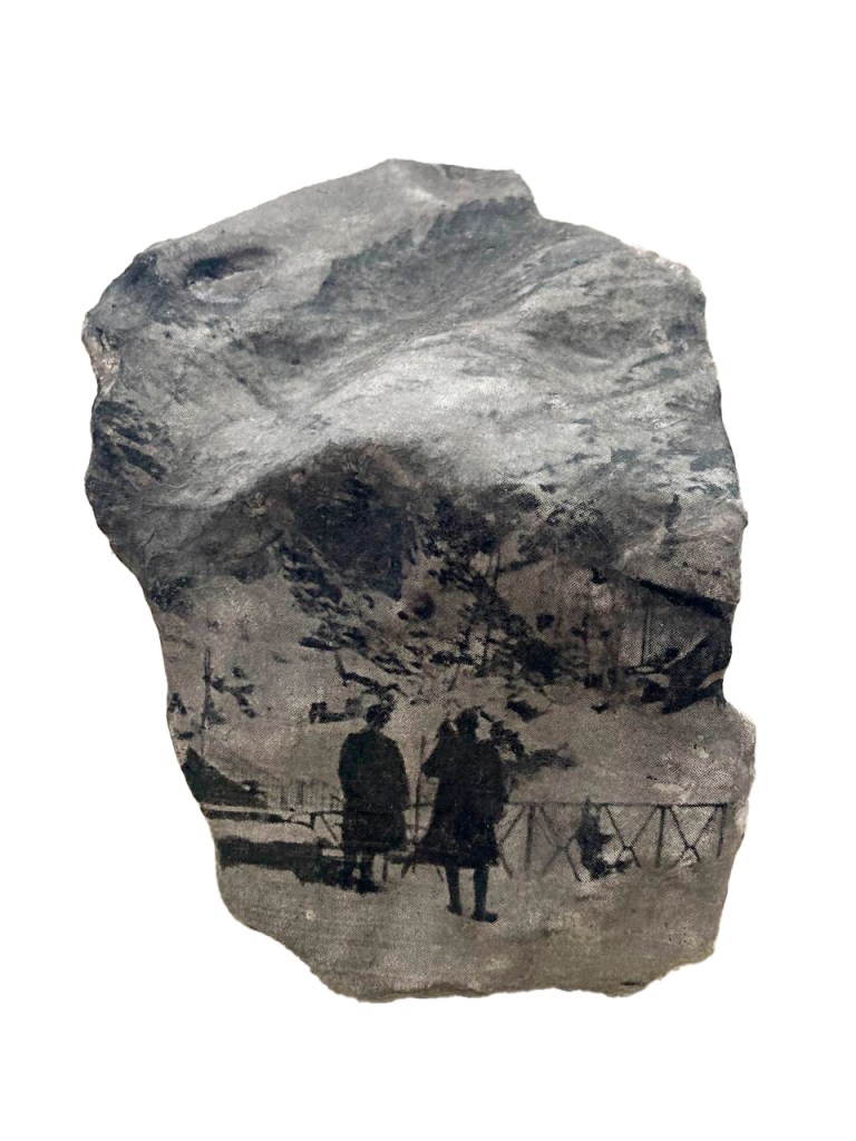 transfert sur une pierre récupérée sur le chemin de l’exil espagnol dans les Pyrénées – 10x16cm